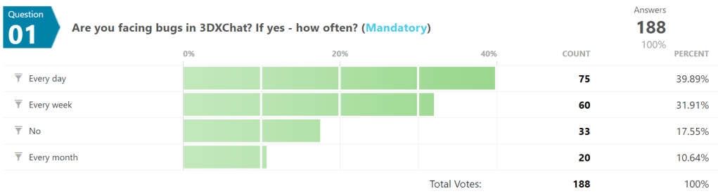 Question 1: Are you facing bugs in 3DXChat? If yes – how often?