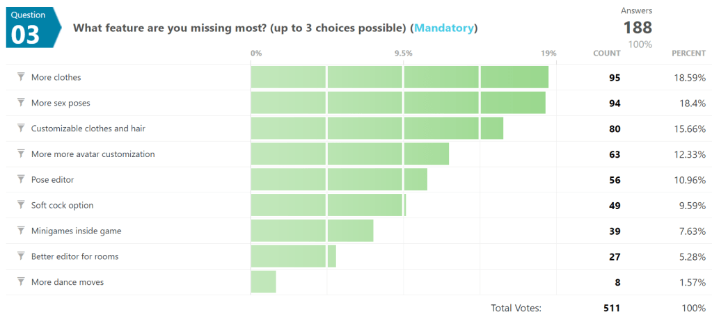 This question was added to the survey in November, as in November clothes and poses are the top missing features. Having said this a “pose editor” and more “customizable clothes and hairs” are in a similar category.