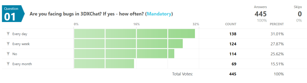 Question 1: Are you facing bugs in 3DXChat? If yes – how often?