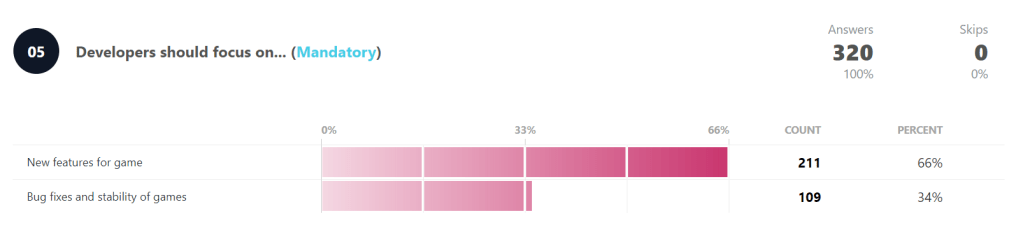 For the sixth time during this survey, the respondents expressed the opinion that new features and not the stability of the game should be the developers’ focus. Six of ten users would prefer working on new features.