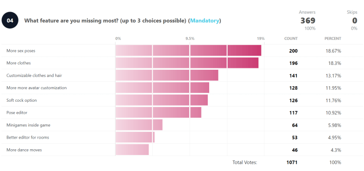 More “Clothes” and “Sex poses” are very close together as most desired features.