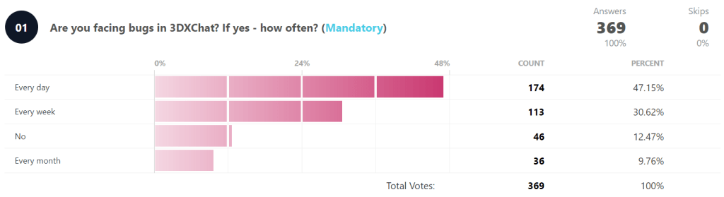 Question 1: Are you facing bugs in 3DXChat? If yes – how often?
