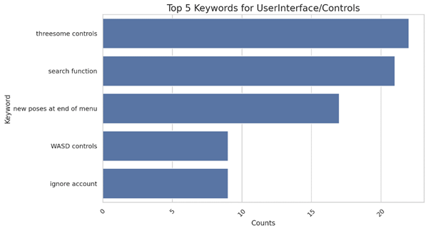 This gives us an idea of the most common issues users are discussing in their feedback. For example, issues related to ‘room’, ‘avatars’, and ‘pose’ seem to be quite common.